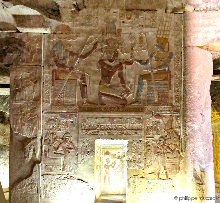 À gauche, l'entrée de la chapelle d'Isis et à droite la chapelle d'Horus. Entre les deux, un panneau composé de plusieurs scènes, avec une niche et les titulatures de Sethy. Cette configuration existe tout au long de la paroi Ouest, avec les 7 entrées de chapelles et les 6 panneaux décrits dans cette partie.(voir un exemple ci-dessous.