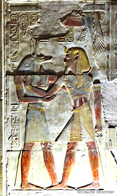 Is (placée du côté de sa chapelle) tient la couronne khepresh sur la tête du roi qui fumigène de l'encens devant Osiris. Isis porte la coiffure hathorique.