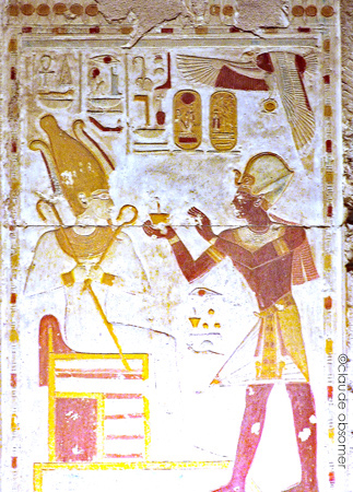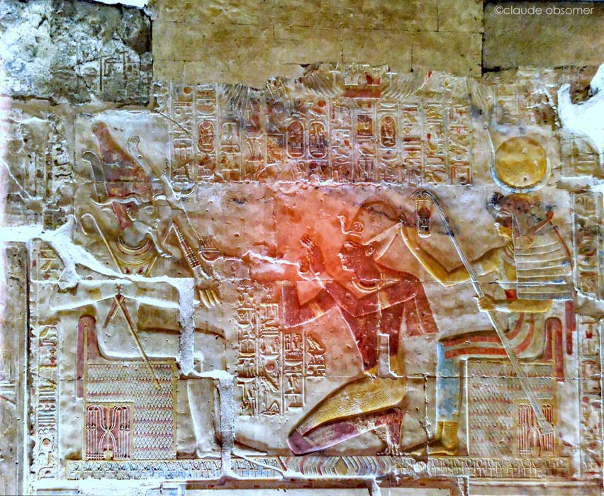 Scène du centre : Le roi fumigène de l'encens devant son "père". Osiris.