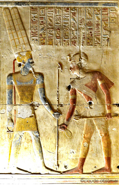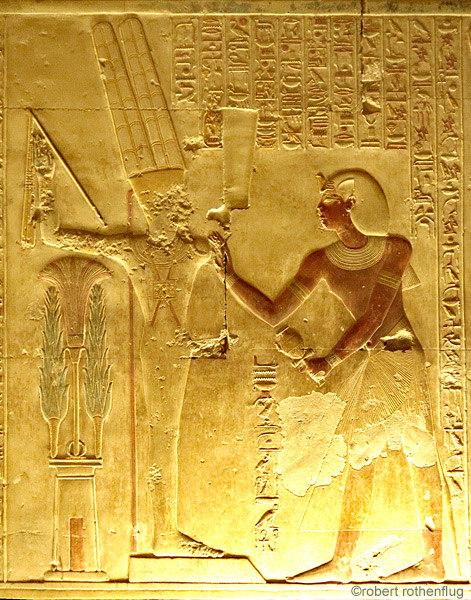 Le roi appose ses mains sur Amon-Rê représenté ithyphallique comme Min.. Le dieu lui donne la joie éternelle.