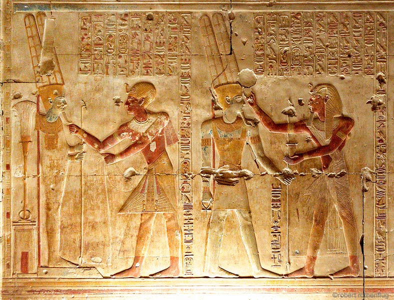 Le roi (Men-Maât-Rê)I vient approvisionner le Per-Our (le temple). Le dieu lui donne la bravoure du Sud et la bravoure du Nord..