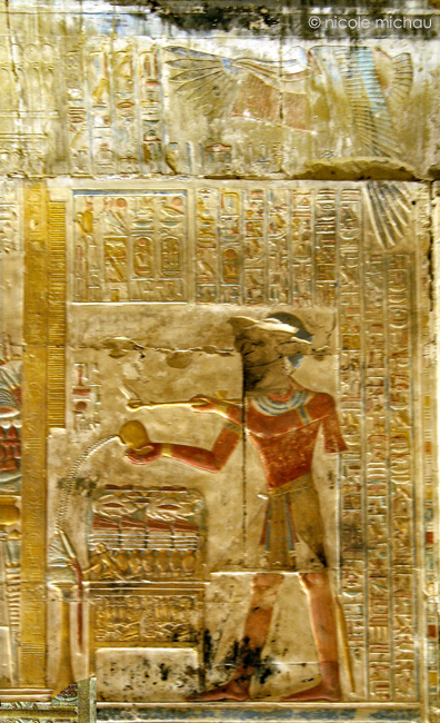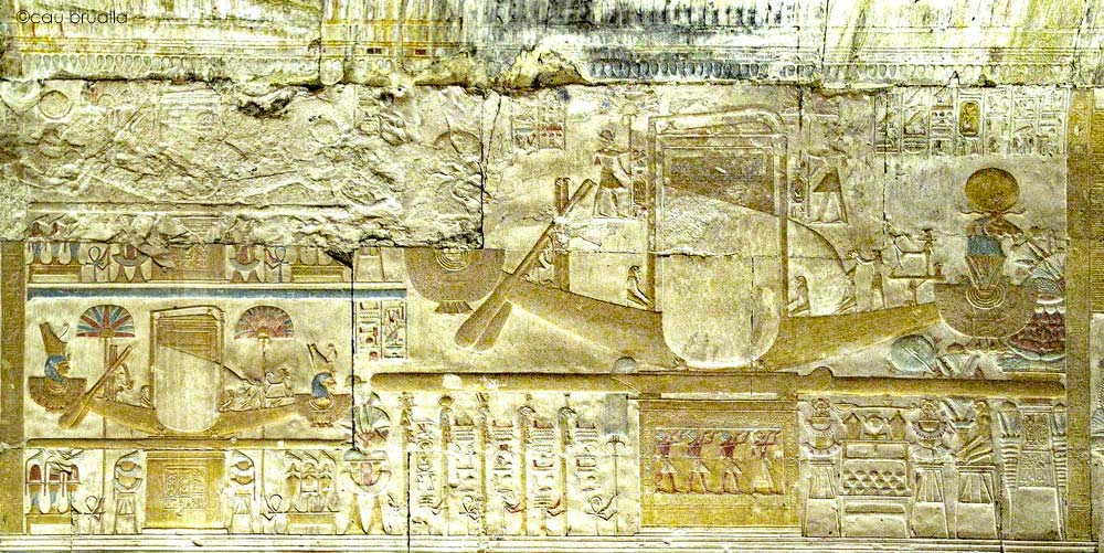 Le roi fumigène de l'encens et verse une libation pour purifier. Il est placé devant la barque d'Amon suivie des barques de Mout et Khonsou représentées de plus petites dimensions. Au dessus du roi, Ouasjet lui donne la couronne sur sa tête, vie et pouvoir..
