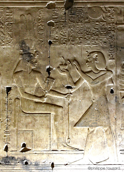 Le roi (Men-Maât-Rê)I fumigène de l'encens devant Isis. Cette action se situe dans le chapitre "entrer dans le sanctuaire"La déesse lui donne toute bravoure, toute victoire et toute joie.
