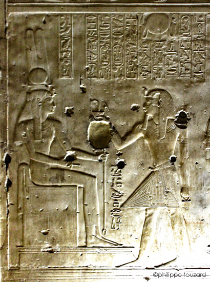Le roi (Men-Maât-Rê)I entre pour dévoiler la face d'Isis la Grande, qui réside dans le château de MenMaâtRê (épithète qui existe dans la plupart des scènes et qui ne sera pas toujours répété dans le commentaire). Isis donne au roi toute joie.