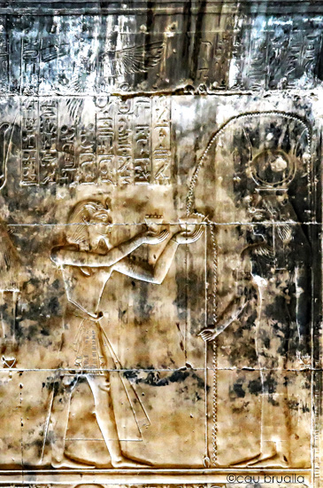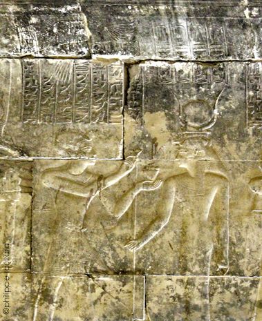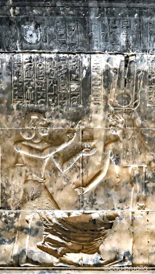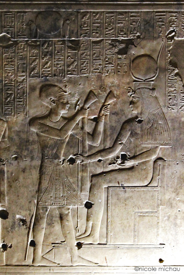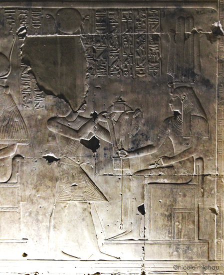 Le roi présente le collier Ousek au dieu Atoum-Khépri mais c'est Isis qui est représentée.