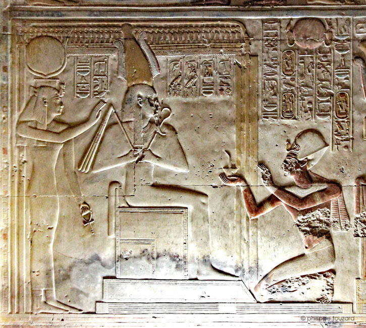 Le roi entre dans le sanctuaire. Il s'agenouille devant le dieu. Osiris qui réside dans le château de Men-Maât-Rê est assis sur son trône Le roi verse une libation avec le vase Nemset.