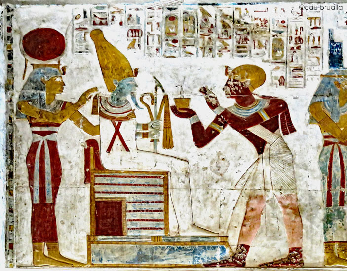 Toujours agenouillé, le roi fait brûler de l'encens dans le naos. . Derrière le dieu, Isis protège Osiris. Osiris donne au roi la durée de vie de Rê. Les dieux sont dits résidents dans le château de MenMaâtRê.