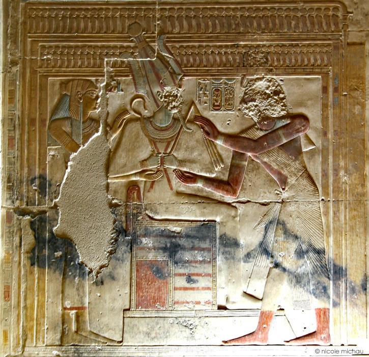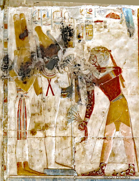 Le roi (Men-Maât-Rê)I entre dans le naos et adore le dieu Osiris d'Abydos, assis sur son trône accompagné d'Isis la Grande. Les dieux résident dans une chapelle double, probablement le naos situé dans la chapelle et la chapelle d'Osiris.