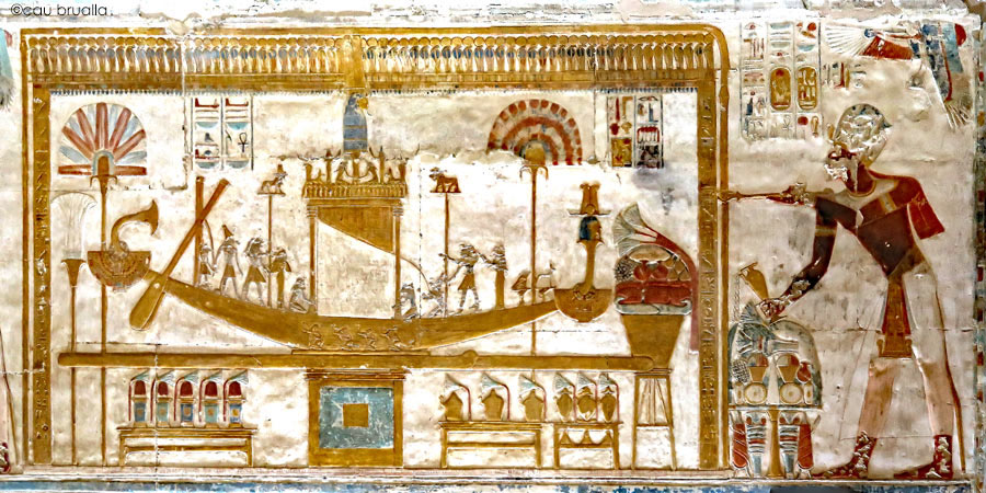 Sous la protection de Behedety, le roi (Men-Maât-Rê)I fumigène de l'encens et verse une libation pour purifier les offrandes devant la barque d'Osiris. Le dieu lui donne toute vie, tout pouvoir et toute bravoure.