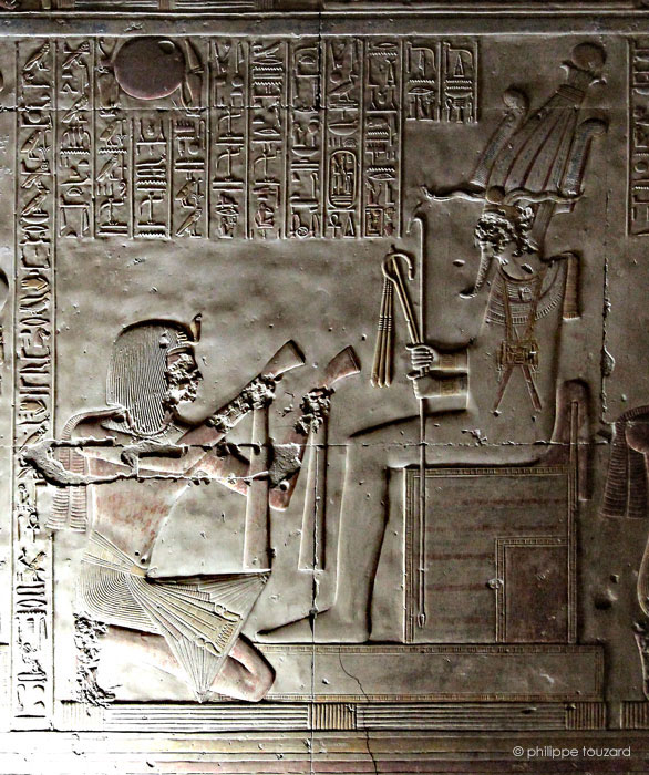 Le titre du rituel précise qu'il s'agit de la scène où le roi doit s'allonger sur le ventre pour flairer la terre. Le roi est seulement à genoux et adore Osiris.