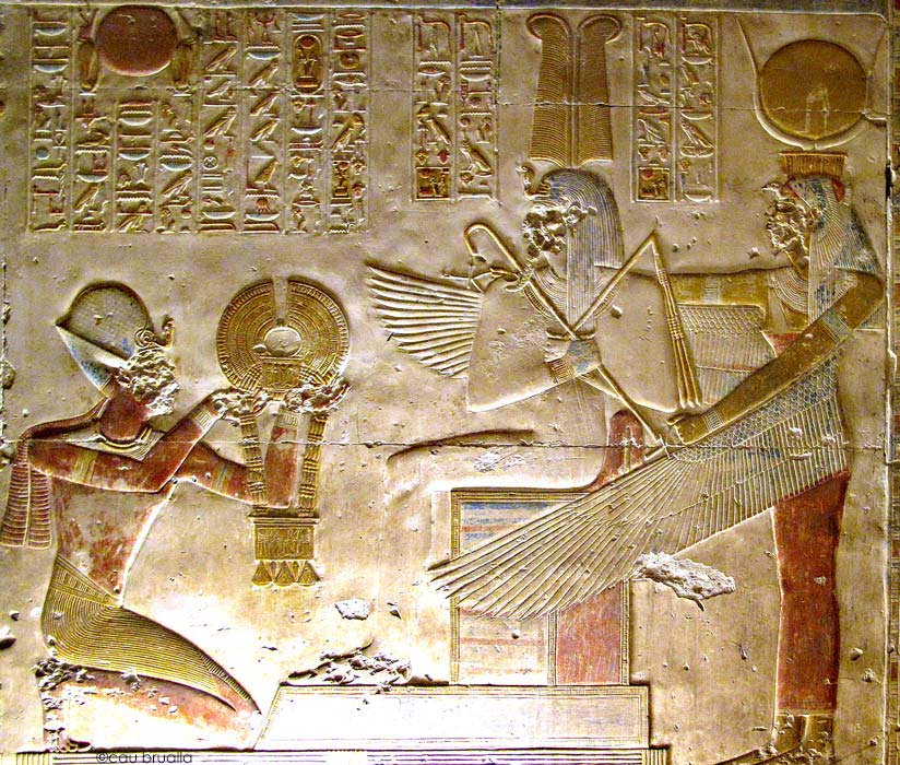 Agenouillé, le roi présente le collier Ousekh à Osiris Khenty imentyou d'Abydos. Derrière le dieu, Isis protège Osiris avec ses ailes. Osiris donne au roi la durée de vie de Rê. Les dieux sont dits résidents dans le château de (Men-Maât-Rê)I.