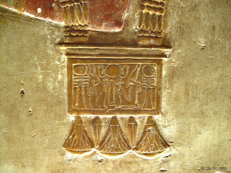 Le roi et s'agenouille devant le dieu. Osiris qui réside dans le château de Men-Maât-Rê)I est assis sur son trône Le roi vient parer le dieu avec le vêtement rouge. Le dieu lui donne vie, stabilité et pouvoir.
