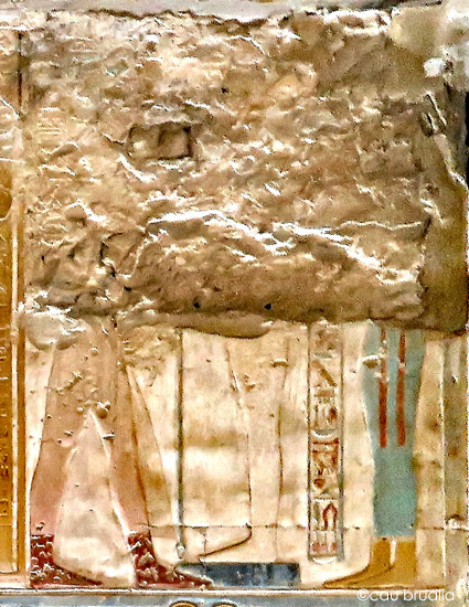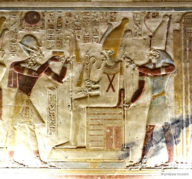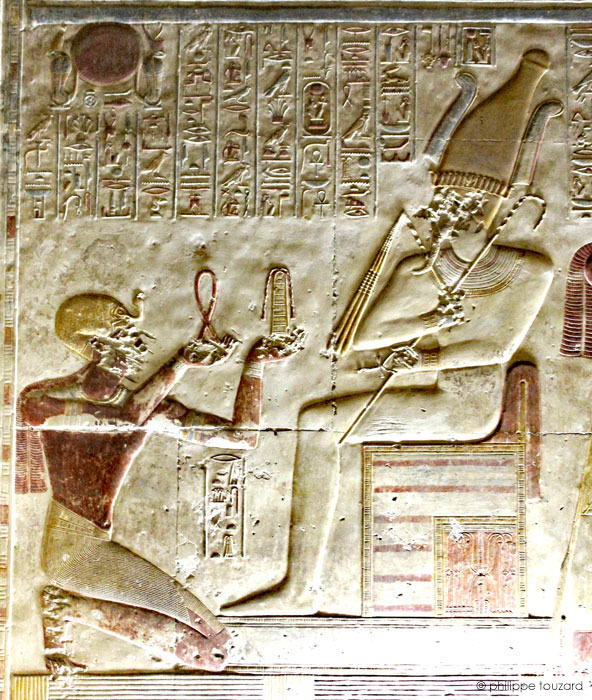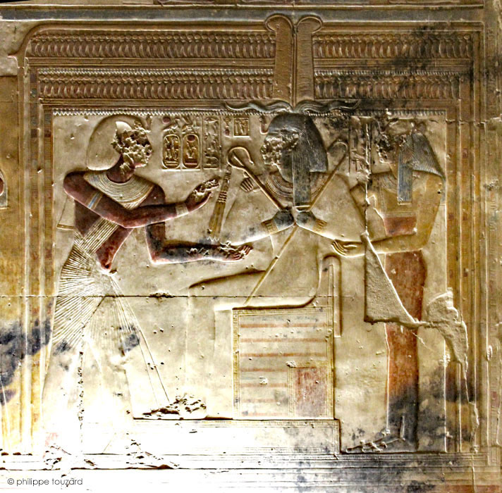 Le roi (Men-Maât-Rê)I entre dans le naos et adore le dieu Osiris d'Abydos, assis sur son trône accompagné d'Isis la Grande. Les dieux résident dans une chapelle double, probablement le naos situé dans la chapelle et la chapelle d'Osiris.