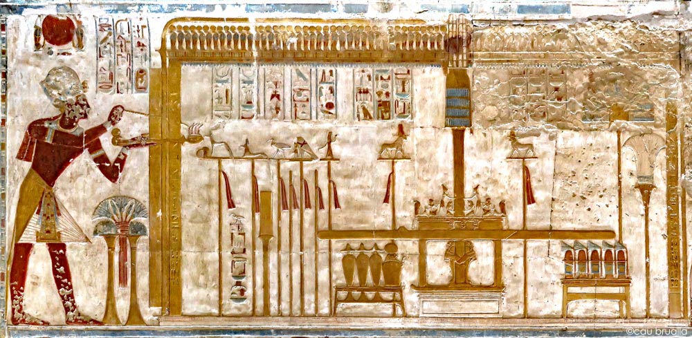 Sous la protection de Behedety, le roi (Men-Maât-Rê)I fumigène de l'encens devant une chapelle contenant le fétiche d'Abydos. La partie centrale ou "châsse" du fétiche d'Abydos est constituée de roseaux. Elle est surmontée de deux grandes plumes. De chaque côté de la châsse, deux enseignes supportent deux béliers avec de hautes plumes : ce sont des représentations