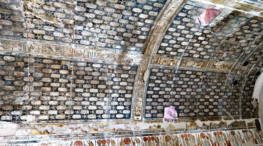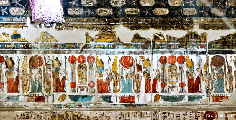 Des étoiles et des cAu dessus de la frise court un bandeau avec un texte. La frise est constituée de divinités et de cartouches (Men Maât Rê)I posés sur le signe de l'or. Par exemple, à partir de Ouadjet avec sa xouronne rouge (la 4ème en partant de la gauche, sont représentés Osiris, un cartouche entouré de 2 colonnes, Osiris, Nekhbet avec sa couronne blanche et tournée vers Osiris, et Rê-Horakhty avec le disque solaire et la plume de Maât. Ce motif se répéte ensuite.