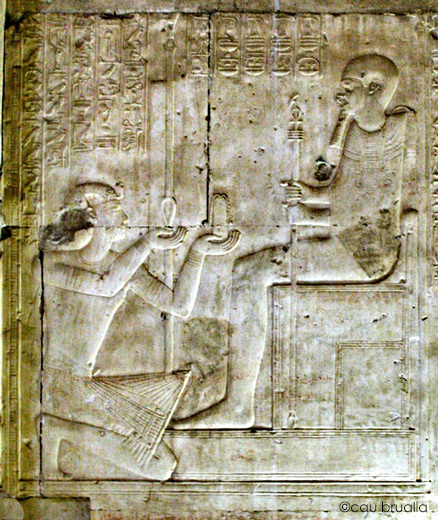 Le roi donne les bracelets des bras et les bracelets des jambes au dieu Ptah accompagné de la déesse Sekhmet sa parèdre. Le dieu lui fait de nombreux dons