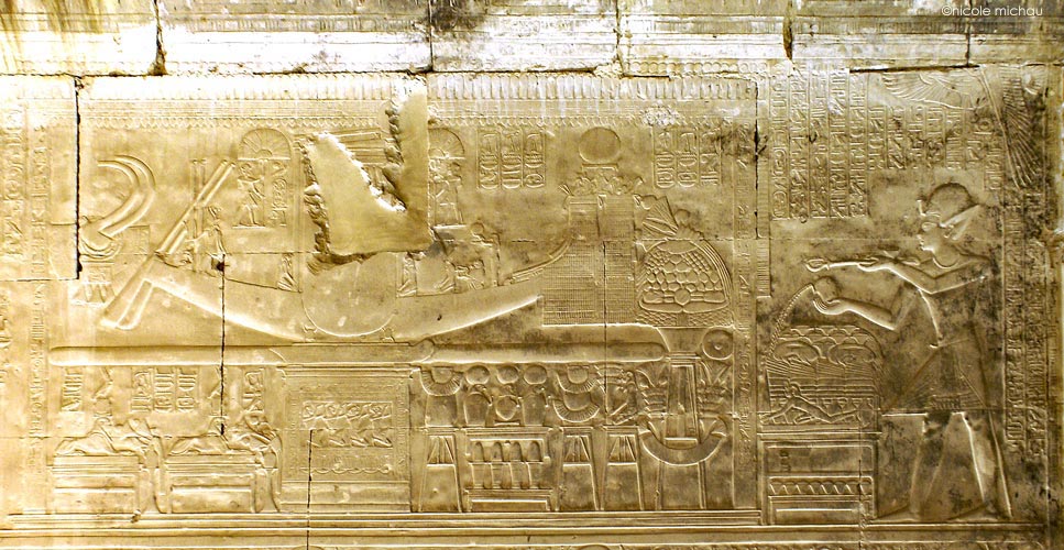 Le roi adore le dieu et fumigène de l'encens 4 fois. Le dieu Rê-Horakhty lui donne en retour une série de bienfaits.(épisode n°16 du rituel)