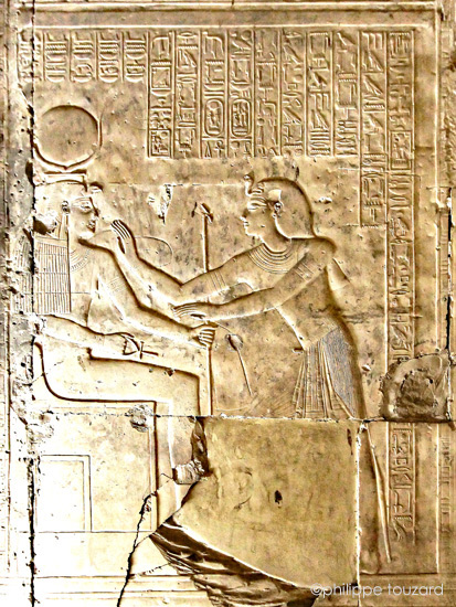 Le roi (Men-Maât-Rê)I arrange le vêtement blanc Nemes sur la déesse Hathor-Nebet-Hetep qui réside dans la château de MenMaâtRê. La déesse lui donne toute bravoure, force, joie et toute nourriture et provision.