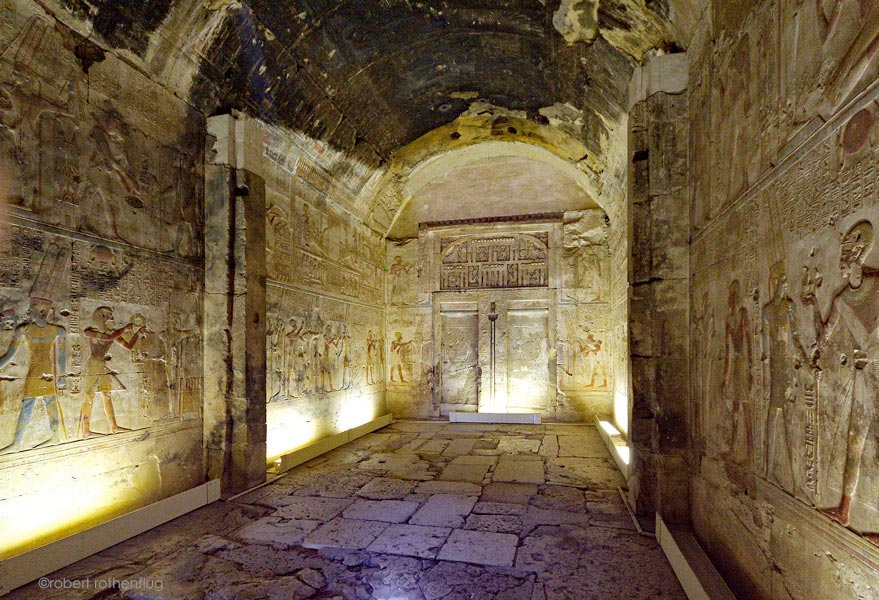 La chapelle comporte sur sa paroi Ouest la représentation d'une porte. Cette porte ne s'ouvre pas, elle est 'fausse' suivant le terme couramment employé. Elle permet la communication virtuelle, magique avec les autres temples de la divinité : par exemple Karnak pour Amon-Rê.