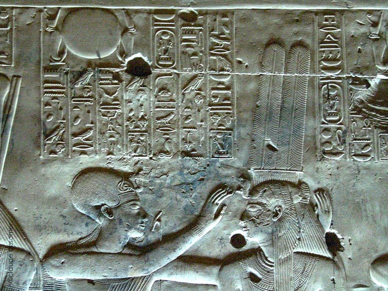 Dans cette scène, le roi Sethy 1er fixe les deux plumes sur la tête de la déesse Isis. La chapelle d'Isis comprend la totalité des scènes du rituel divin journalier, comme la chapelle de Rê-Horakhty. Dans sa présentation, certaines scènes sont manquantes, principalement à cause de la dégradation du support qui rend la prise de vues beaucoup plus difficile pour avoir une bonne netteté.
