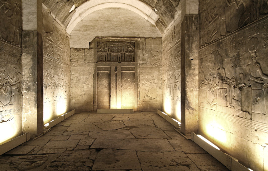 Cette section présente les scènes des chapelles de Ptah, démiurge de Menphis et la chapelle de Rê-Horakhty, le grand dieu d'Hermopolis (vue ci-dessus). La chapelle de Rê-Horakhty présente sur ses parois l'ensemble des scènes du rituel, même si certaines scènes sont difficilement lisibles ou dégradées. Dans la chapelle de Ptah, certaines scènes ont disparu. La description de la chapelle de Rê-Horakhty, présentée ici en preùier, permettra une meilleure appréciation du rituel divin journalier.