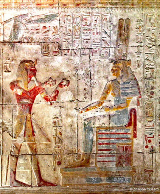 Le roi élève un plateau d'offrandes devant sa mère Isis. qui lui donne la bravoure sur le Sud, la victoire sur le Nord. Nekhbet plane sur cette scène.