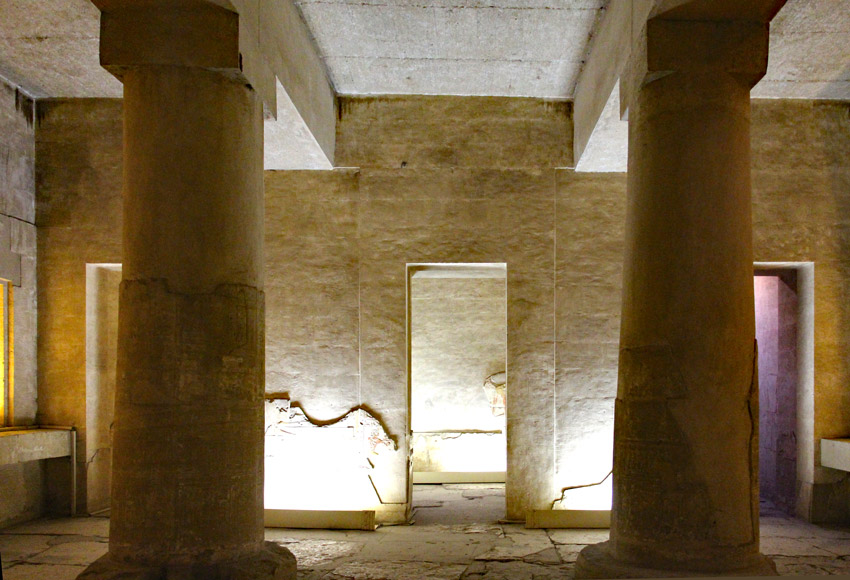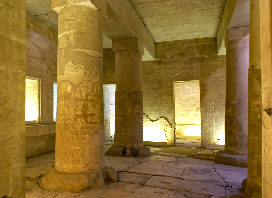 Trois chapelles de 3,6 m. de long se situent du côté Sud. La plus large se situe au milieu (2,90 m. contre environ 2,50 pour les autres). Ce qui reste des scènes permet à peine de se faire une idée de leur décoration. Osiris y était représenté plusieurs fois sur sa couche, entourée de divinités. La renaissance du dieu semble en être la motivation principale. |