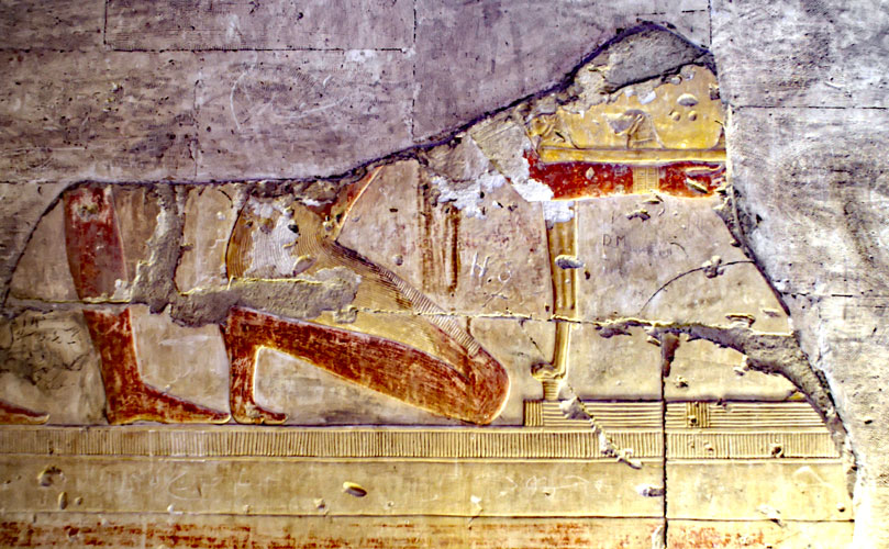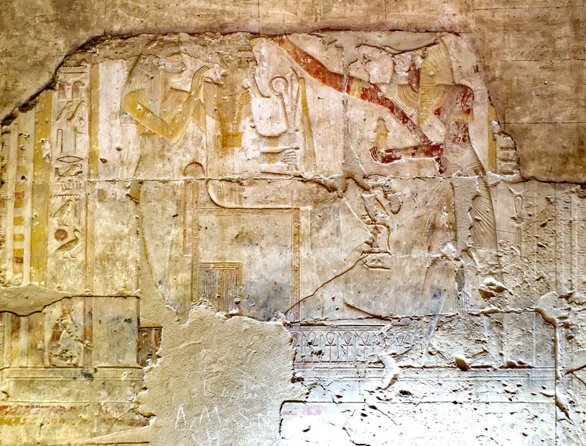 Le roi accomplit le riye d'oindre le front du dieu son père Osiris avec de l'huile. Le dieu, assis dur un trône donne au roi la force et la puissance. Derrière Osiris, une déesse , Isis (?) fait le sidne de protection.