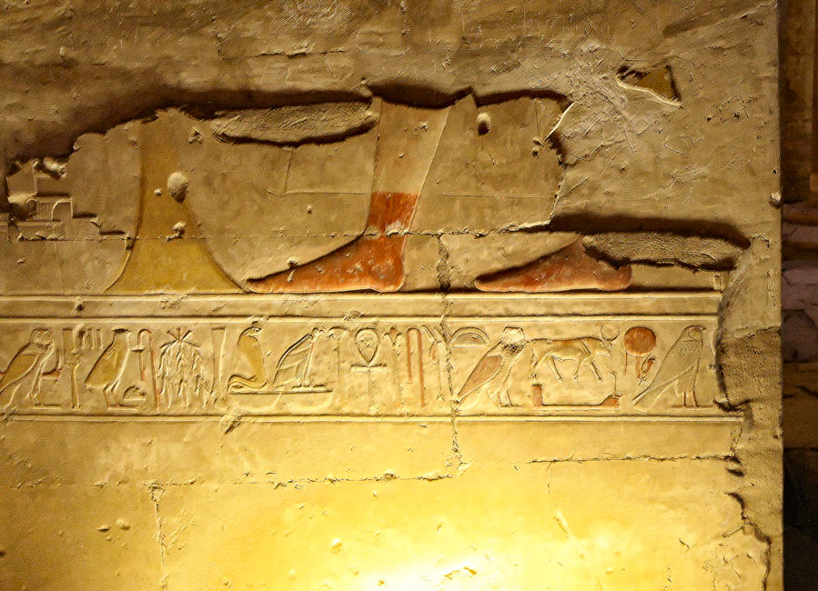 Dans la scène au dessus du bandeau, le roi offre du vin à son père Osiris qui est sur un socle de statue , suivi par Isis. Dans les textes, le roi est loué pour le beau monument qu'il a fait pour son père. Sur le bandeau du bas, est inscrit le nom des Deux-Maîtresses. |