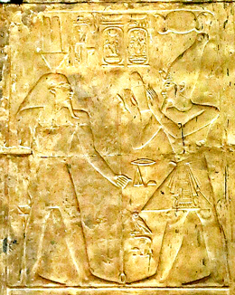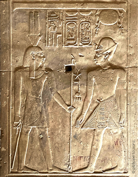 Le roi présente un flacon d'huile Medj au dieu Nefertoum.
