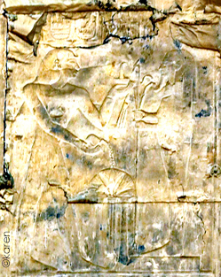 Sur le linteau, le roi accomplit une course rituelle devant Nefertoum. À droite, il court avec un fléau et une rame et ç gauche, avec un gouvernail. Au milieu, deux cartouches verticaux sont posés sur le signe de l'or.