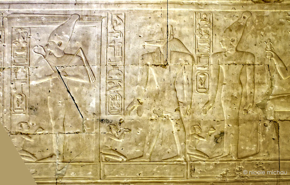 La liste de 51 dieux est composée de 9 sections délimitées par les inscriptions du bandeau. Derrière le roi, la 9ème section de 10 noms (vue partielle) commence par le nom de Khnoum suivi d'un dieu faucon. Devant le roi, la vue partielle ne montre que 14 noms, soit les 5ème (3 sur 4), 6ème (3 noms), 7ème (3 noms) et 8ème (5 noms).( la liste complète des noms se trouve dans le site AbydosSethy). Les premiers noms de la liste ci-dessus sont Sobek et Djedou.