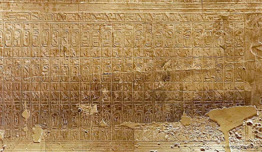 Sethy 1er indique qu'il est celui qui "fournit une offrande aux rois de Haute et Basse Égypte". La ligne du haut énumère la liste des offrandes : "...un millier de pains, un millier de cruches de bière, un millier de bovins, ..un millier d'encens, ..un millier de vêtements, ..un millier de vins, ..."Cette liste était psalmodié par le prêtre pour chaque roi dont nom était suivi par l'expression "don du roi " alternativement de Haute ou Basse Égypte.