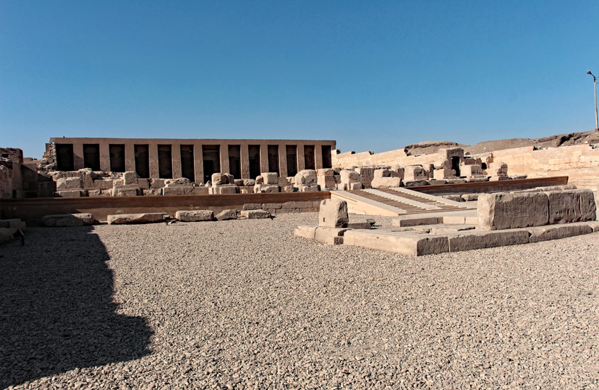 enfouie sous le village (Caufield, 1902). Elle était bordée à l'Est par un pylône complètement détruit maintenant. Sur la face interne de ce pylône, des statues osiriaques représentaient Sethy et Ramsès II. Sa dimension totale est d'environ 50 m. par 50 m.
