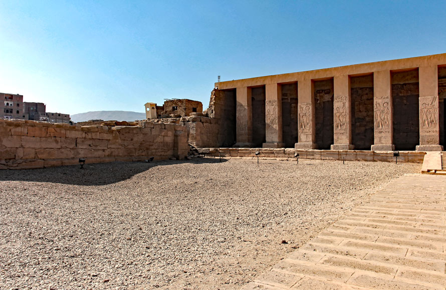 Sur ses parois; d'autres défilé des fils et des filles de Ramsès II y ont été gravés, mais leurs vestiges sont moins bien préservés que ceux se l'autre face. Les scènes de la paroi Nord se terminent par une scène dite du massacre des ennemis et par une scène avec Osiris sous le portique. DuDu côté Sud, une porte permet d'accéder aux entrepôts et aux magasins qui jouxtent