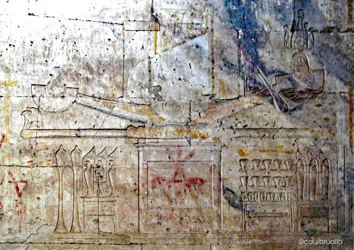 Cette partie de la salle est peu gravée. La scène se devine par endroits, seulement peinte. Deux figures du roi se tournent le dos, faisant des offrandes à des barques différentes. Le roi est représenté avec deux couronnes différentes. |