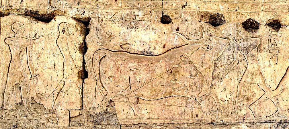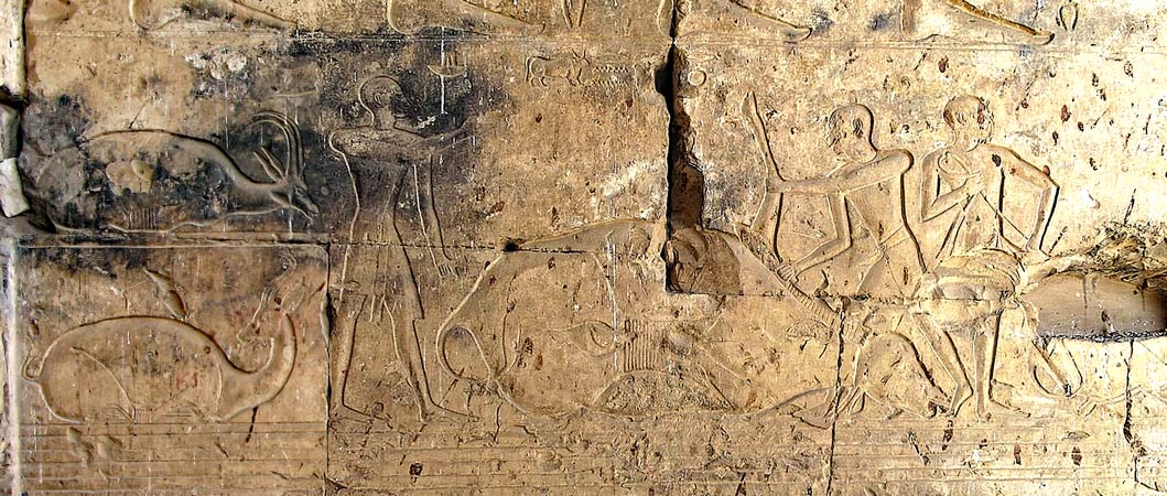 Les scènes commencent sur le registre du bas de la paroi Ouest pour se poursuivre sur la paroi Nord au même registre. Les bouchers emmènent un bœuf à longues cornes vers la salle de boucherie.