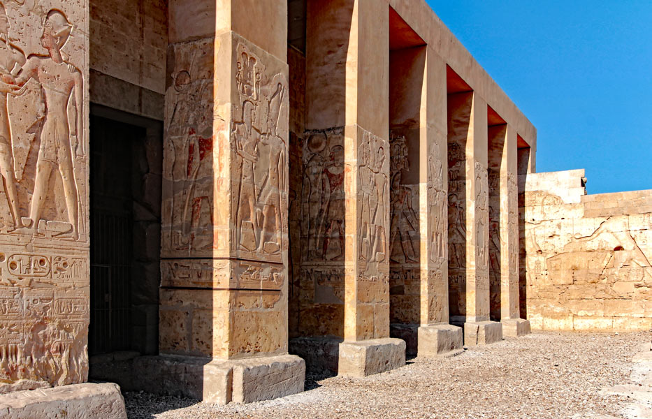 faces en dessous des scènes. Ils décrivent les actions menés par Ramsès II et notamment qu'il a remis en état les monuments de Sethy 1er.