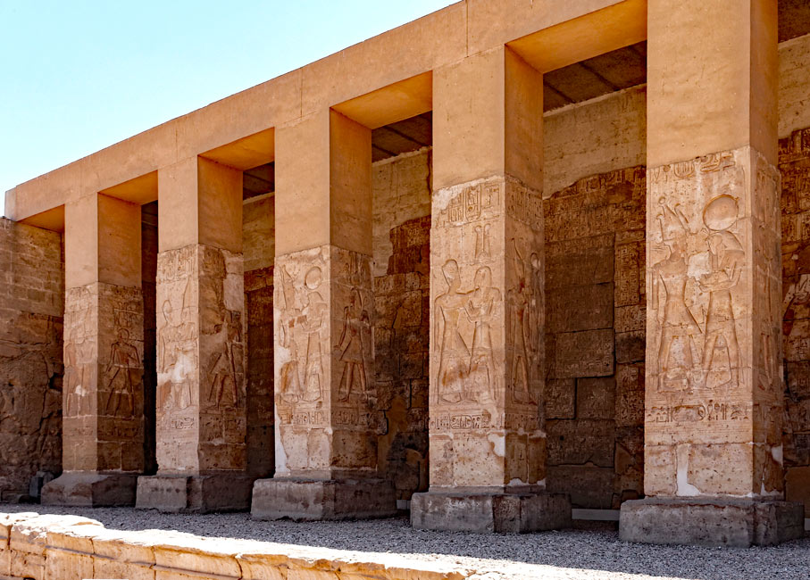 Les piliers sont dédorés sur leurs 4 faces. Sur les faces tournées vers l'Est,différentes divinités donnent l'accolade à Ramsès II. Les faces Nord et Sud montrent des scènes différentes suivant leur position dans les piliers : ceux qui sont les plus près du centre ont une scène avec une déesse (voir ci-dessus), les autres montrent le roi seul tourné vers l'extérieur). Une bande de textes court suivant les 4