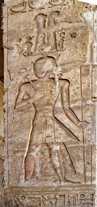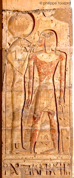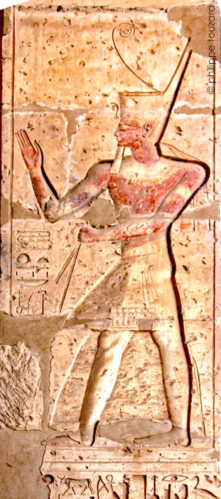 Le texte en dessous constitue de l'inscription de Ramsès II qui fait le tour du pilier : 'Que vive l'Horus, le taureau puissant, aim" de la Maât, le dieu parfait..'.