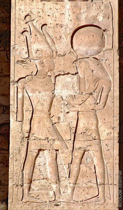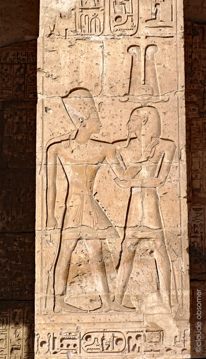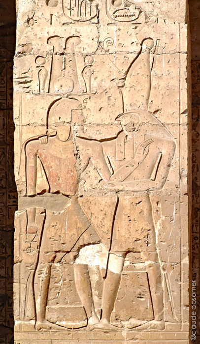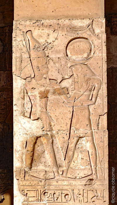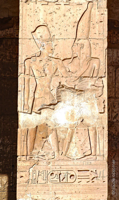 Le texte en dessous est assez bien conservé : "le roi de Haute et Basse Egypte, le maître des Deux Terres (Ouser Maât Rê, Setep n Rê)I, (qui) a pris soin du temple de son père".
