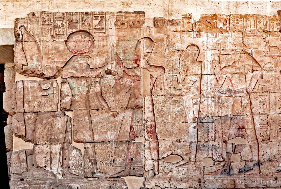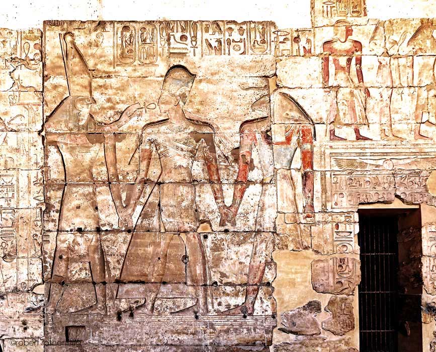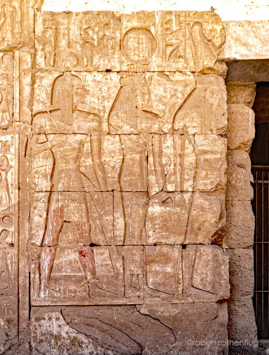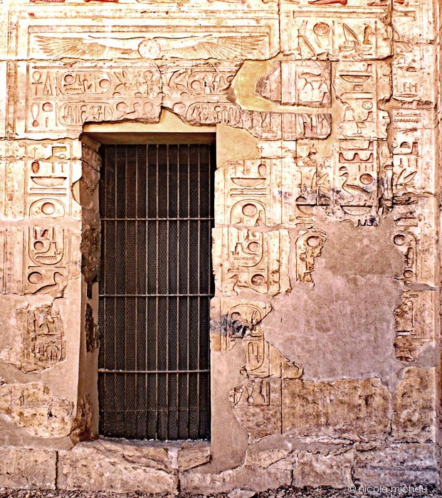 la porte d'Horus menait à la travée d'Horus jusqu'à sa chapelle. Autour de la porte, les titulatures de Ramsès II.
