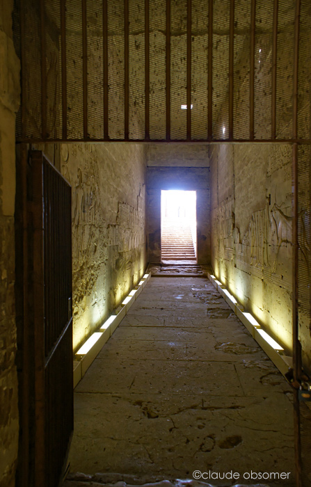 Au bout de ce couloir, sis marches permettent d'accéder au grand escalier qui conduit à la porte de sortie. Le dénivelé entre le sol du couloir des rois et le désert s'élève à 2,75 m.
