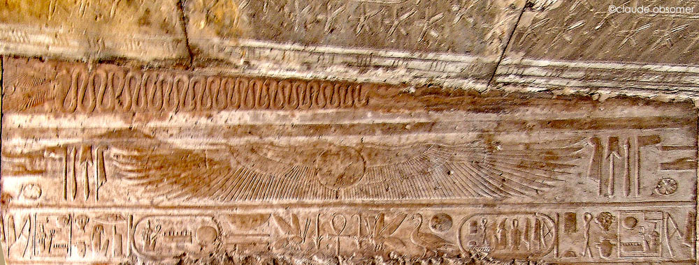 Le plafond du couloir des rois n'est pas horizontal, ce qui crée e un espace triangulaire entre le linteau et le plafond. Cet espace est rempli par les circonvolutions d'un serpent protecteur tourné vers le Sud. En dessous, le disque ailé de Behedety déploie ces ailes. La phrase inscrite en dessous est classique : "Vive le fils de Rê (Sethy Merenptah)I