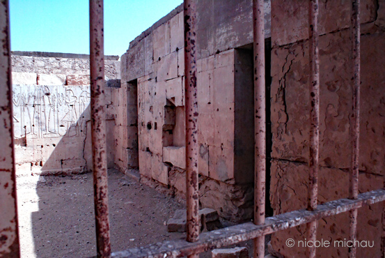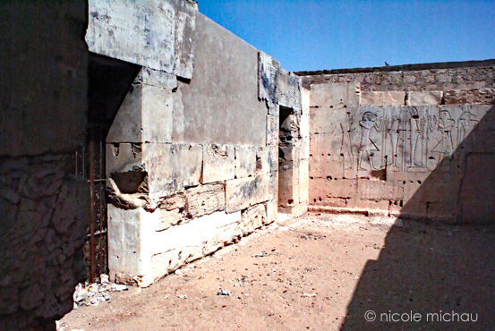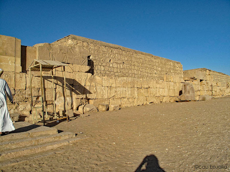 À gauche, se devine le montant droit de la porte de sortie du temple avec la guérite du gardien et le gardien. Sur le mur extérieur Ouest plusieurs scènes d'offrandes montrent Ramsès II devant des divinités : il n'en reste que la partie inférieure le plus souvent. À droite, la porte de la salle dite des archives.