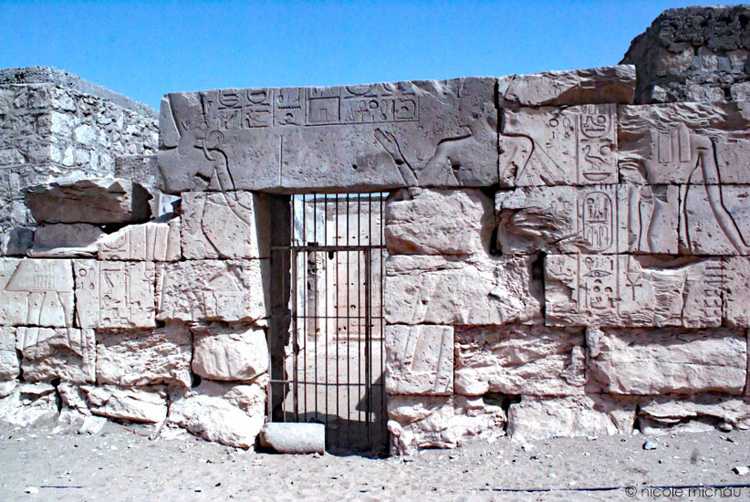 La porte d'entér de la salle des archives montreb le dieu et le roi dont les silhouettes s'étendent du linteau aux montants. Le roi, à gauche, porte la couronne blanche. Le dieu, à droite, montre la porte, donnant ainsi la permission d'entrée.