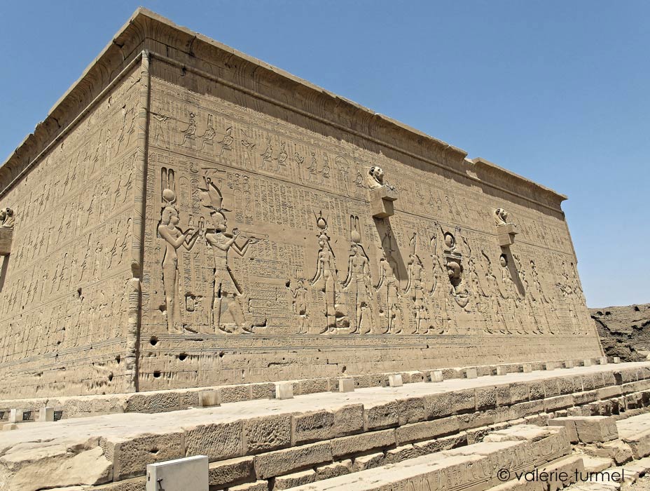 Sur la façade Sud majestueuse, gravée dans l'axe, la tête d'Hathor fait face par delà les distances à la face Nord du temple d'Edfou où se trouve Horus. De chaque côté de la tête, deux processions de dieux sont honorées par Cléopâtre et Césarion.