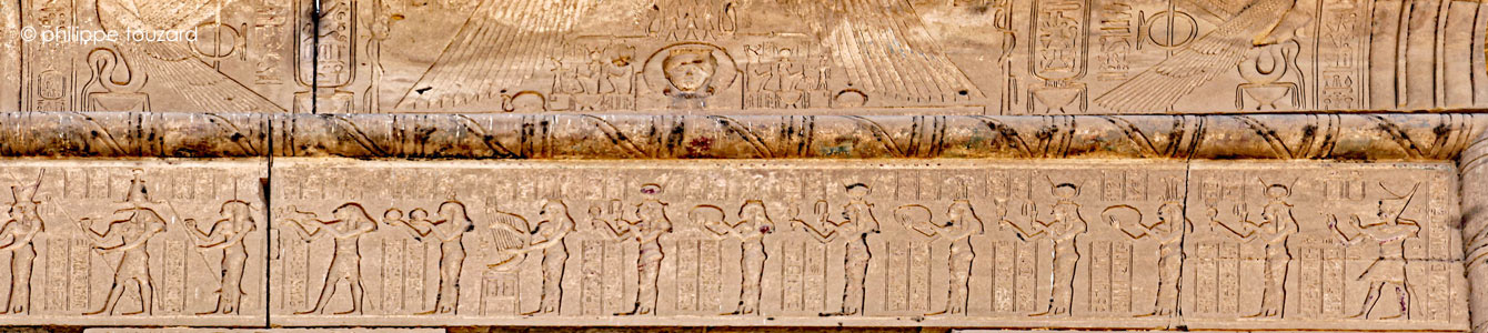 Dans le défilé des déesses et des dieux, les 7 Ihy, les 7 Hathor musiciennes, l'Ogdoade, Harsomtous, les prêtres ritualistes..