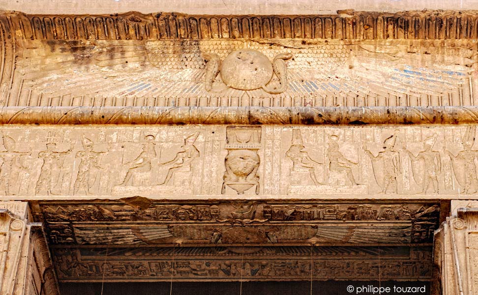 Á l'arrière du temple, Hathor fait face au Sud, vers le domaine d'Horus à Edfou.