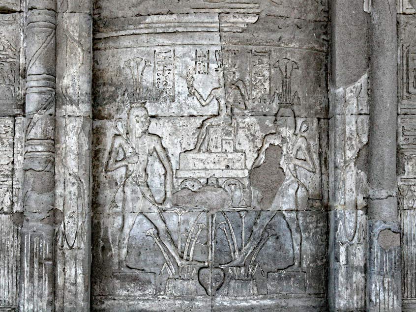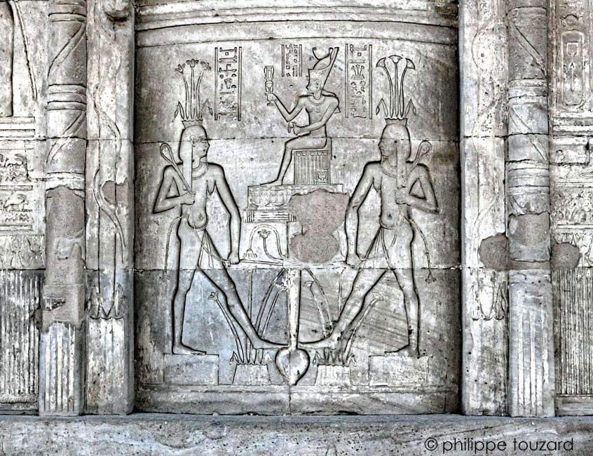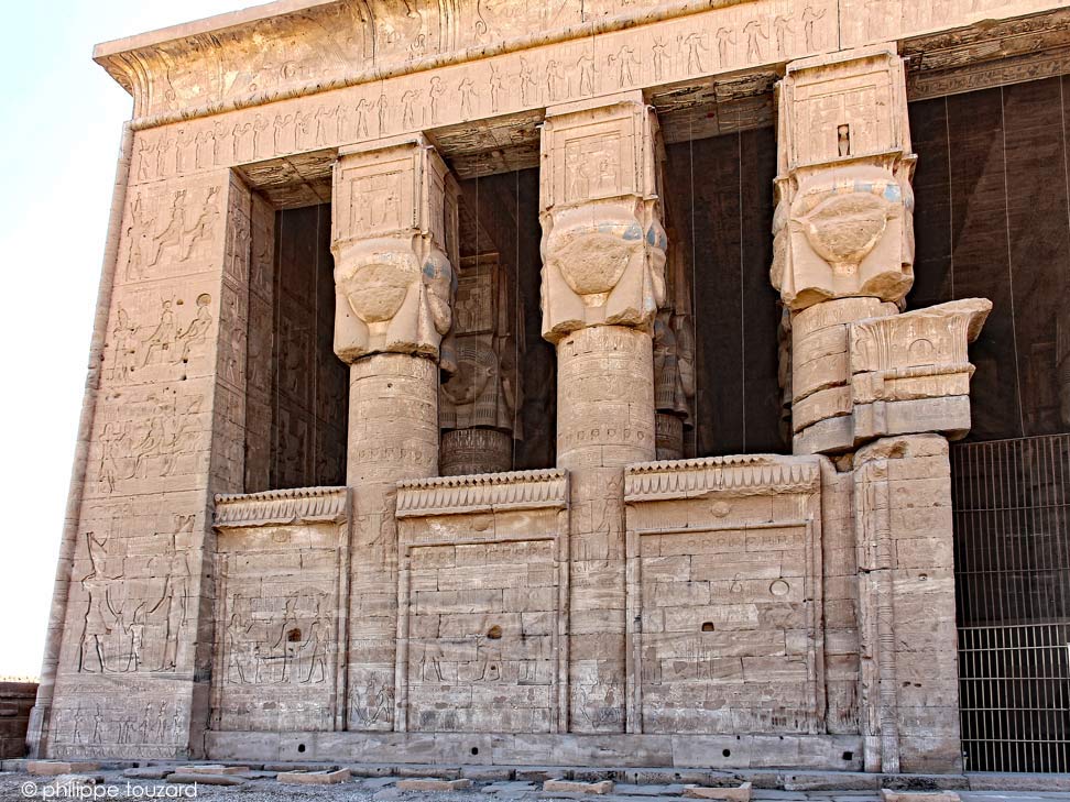 [Le côté Est][Le côté Ouest][Les colonnes de la façade][Les heures du jour et de la nuit][Hathor et le défilé][La porte axiale]